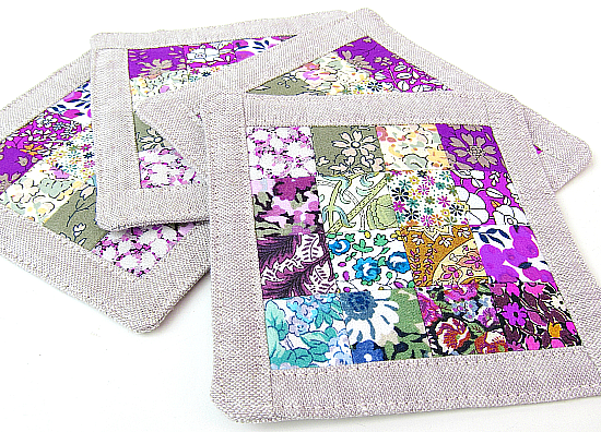 Your favorite scraps will be wonderful in this set of patchwork coasters. Create a pretty combination and choose a contrasting fabric, like the linen used here, for the borders.