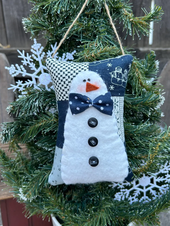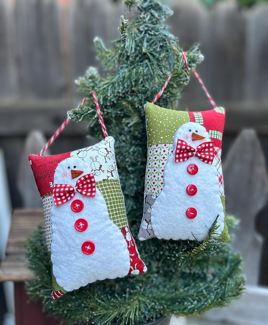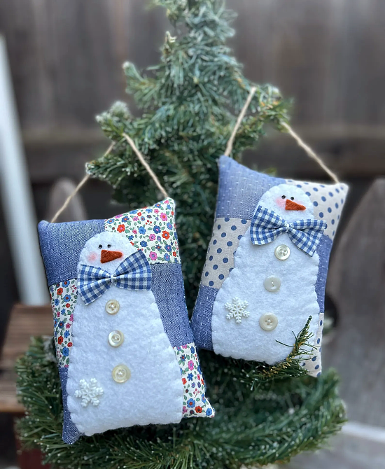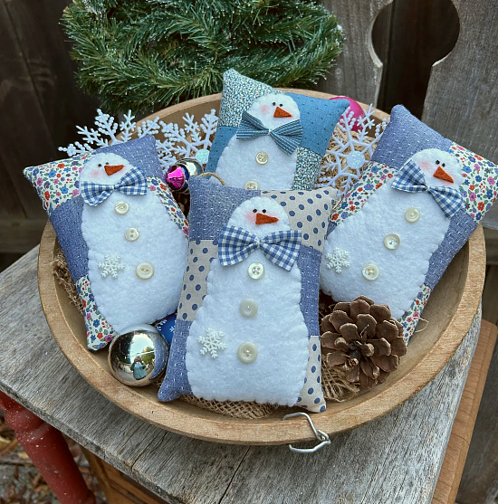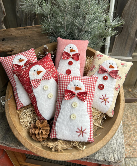 Cute little snowmen adorn these charming mini pillows. They will be fun tucked into a centerpiece or wreath, mingling in a bowl, strung for a garland, and much more. They also make great gifts, so go ahead and make several.