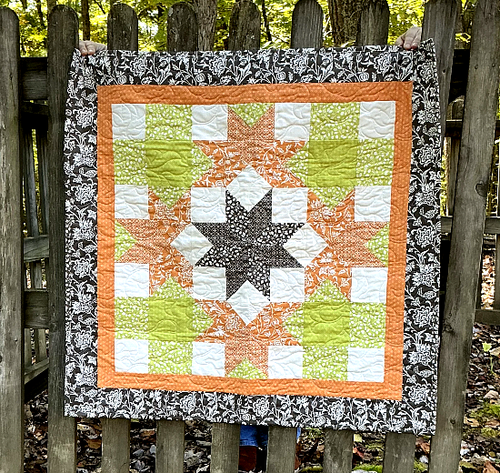 The completed quilt designed by Victoria Hansel-Kuehn from Flabby Tabby Designs is 32″ x 32″.