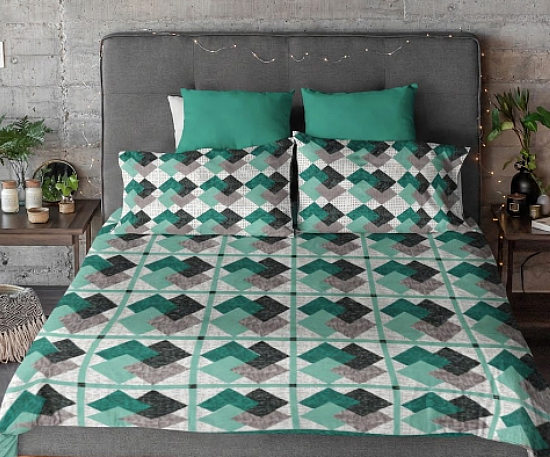 Interlocking Card Trick blocks in three colors make a stunning quilt. The complex-looking design is easier to make than it may seem, and the jade green is an unexpected and striking color choice.