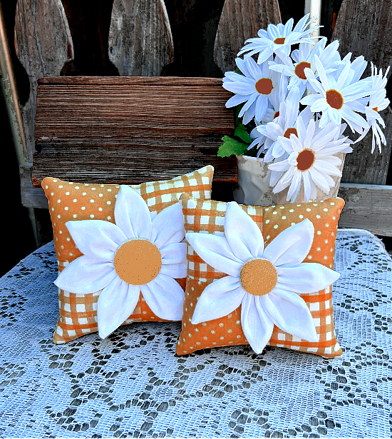 Accent your home with sweet mini pillows decorated with charming daisies. Stack several in a bowl, tuck one into a wreath or centerpiece, or simply set one or more on a shelf.