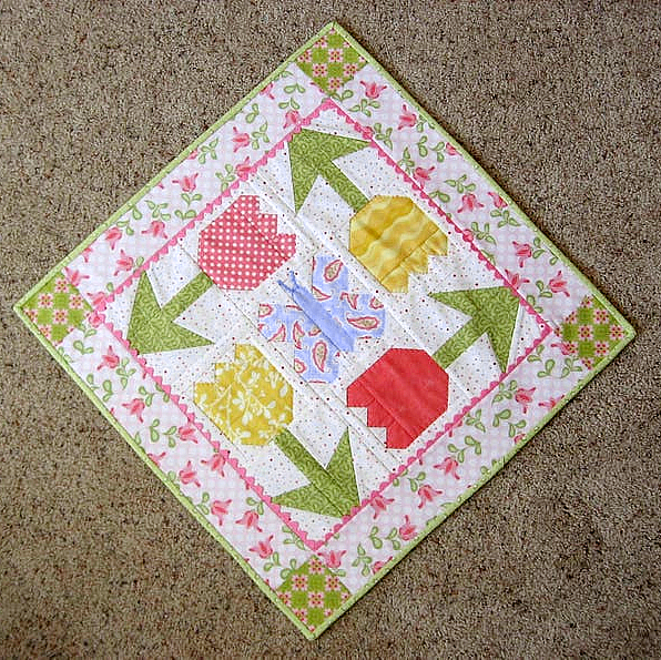 Pretty pieced tulips surround a fluttering butterfly in this sweet little quilt. Rick rack frames the center for a lovely finishing touch.