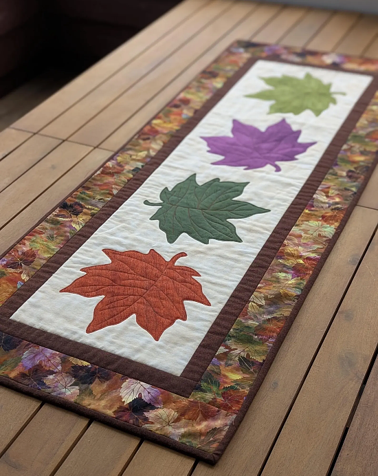 Colorful maple leaves take center stage in this beautiful runner. Twisting this way and that, they almost seem like they’re drifting to the ground.