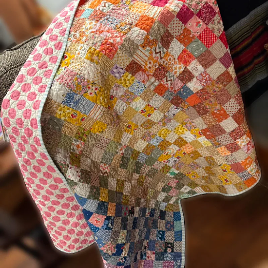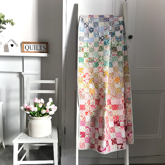 A traditional postage stamp-style quilt is given a new twist in this charming quilt. The colors are arranged to create a rainbow effect that’s both beautiful and captivating.
