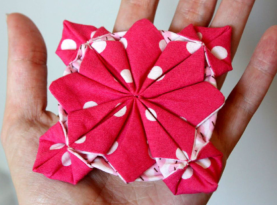 Make a pretty flower to accent a bag or the side of a fabric storage basket. Use one or more to add dimension to a throw pillow or wall quilt. You can even add them to clothing that will go through the wash.