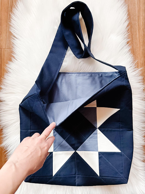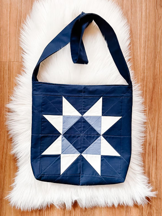 A classic Sawtooth Star block shines on this eye-catching tote bag. The bag is sturdy, practical, and satisfying to make.