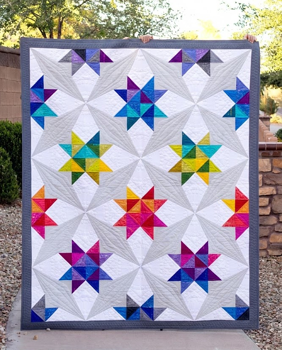 Brilliant crayon colors dance against gray and white in this striking quilt. The transition from cool to warm and back to cool colors moves the eye around the quilt.