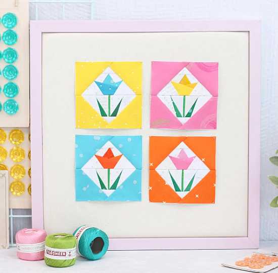 Choose a colorful combination of low-volume prints for these charming tulip quilt blocks. The flower in a square design will be beautiful in any color theme.