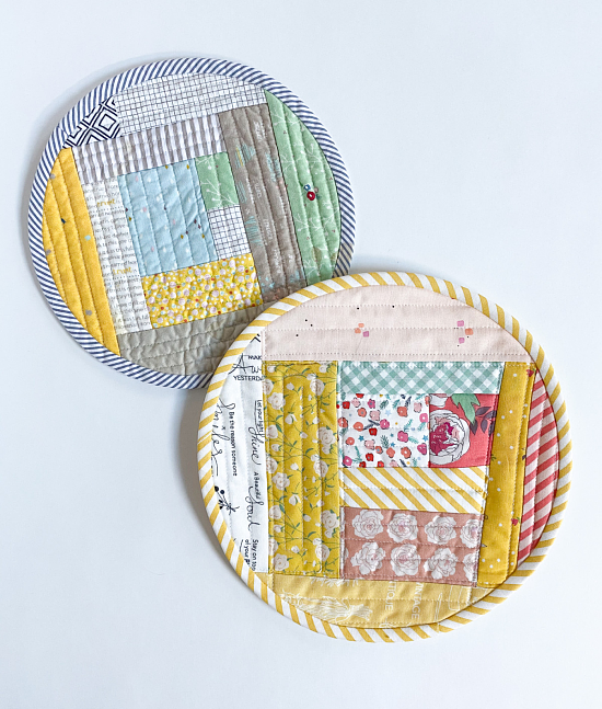 The trivets shown here, designed by Minki Kim, are 10” and 8 3/4” across. Cutting templates are included (use a round object, such as a cup or bowl, to create templates for other sizes). We All Sew provides the free tutorial.
