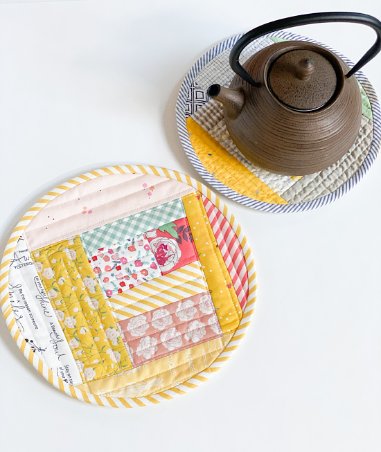 Turn scraps into pretty trivets with Quilt-As-You-Go. They’re so easy to make and charming in any color theme.