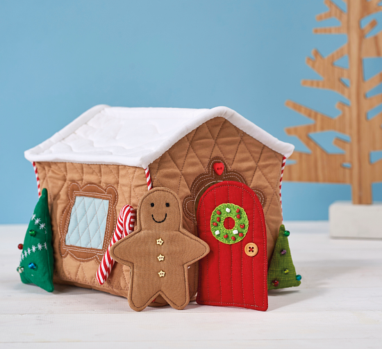 Decorate for the holidays with a sweet quilted gingerbread house that will never go stale. Add a gingerbread man, a candy cane, and trees to create a charming display.