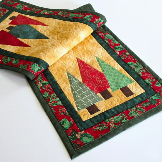 Fusible applique is used for the trees, and an easy fold-over binding makes for a quick finish. Plus, it will be just as lovely in frosty colors for display all winter.