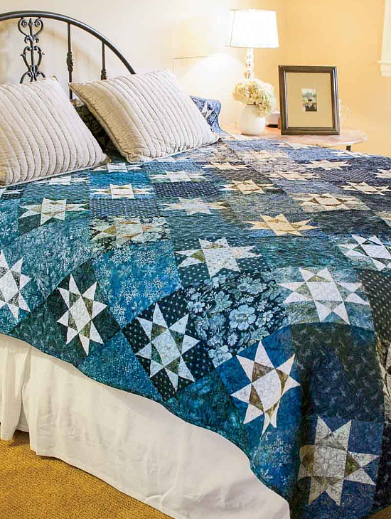 Snowflake prints, blue and white polka dots, and even frosty florals make the quilt perfect for winter. Or use fabrics you’ll enjoy all year.