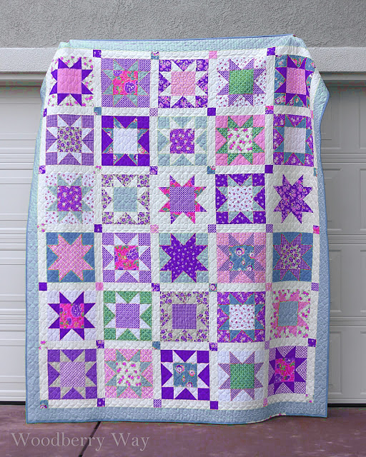 The finished quilt, by Allison at Woodberry Way, is about 79″ x 93″. Of course, you can make yours whatever size you want by varying the number of blocks or by changing the block size.