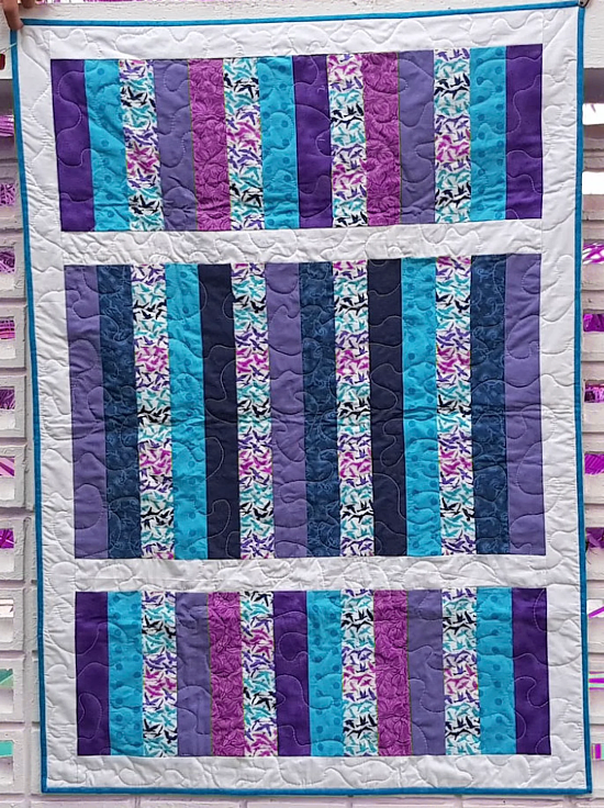 The completed quilt is 32″ x 48″, perfect for a baby. A full jelly roll will make a throw-sized quilt or reduce the width for a charming table runner.