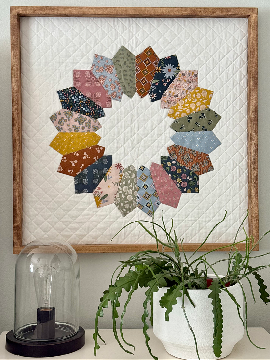 Finish your Dresden Plate into a wall hanging, large throw pillow, or table quilt. Amber’s husband made a 26″ square wooden frame for hers.