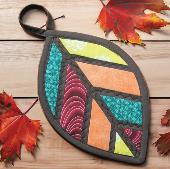 Leftover autumn prints are perfect for this charming hot pad. It’s nicely sized to protect surfaces from hot dishes from the oven. It can also be used as a potholder or mug rug.