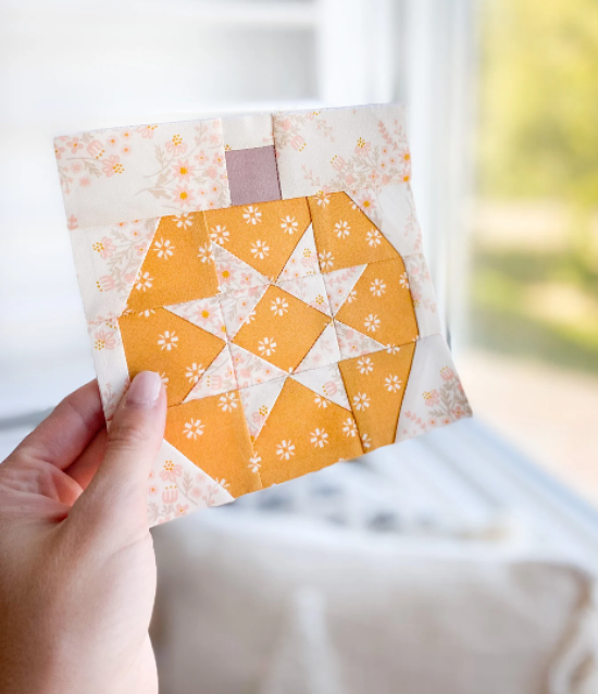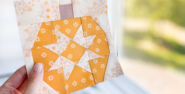 This charming little pumpkin block is perfect for fall projects. A low-volume print for the star and background contributes to its sweet personality.
