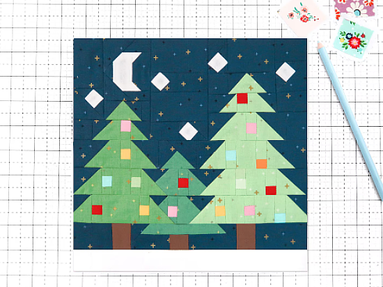 Three festive trees are ready to welcome Christmas in this charming quilt block. Imagine them in a tree lot, or at the edge of a forest under a sparkling night sky.