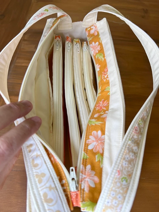Double handles add flair while the zippered top keeps the contents secured. What really sets it apart are the two zippered double pockets. They slide in and out of the bag as needed, and when in place, provide four pockets to keep everything organized.