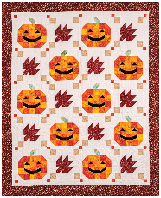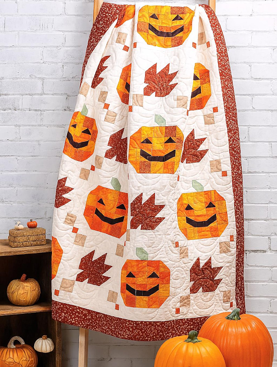 Friendly Jack-o’-Lanterns smile among falling leaves in this charming quilt. It will be a fun and happy addition to your Halloween decor every fall.