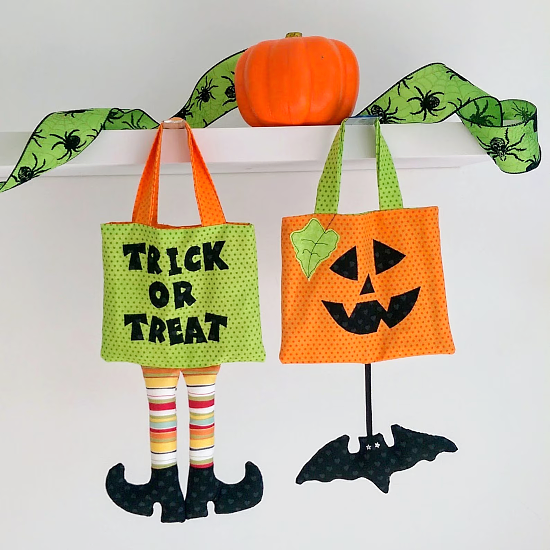 The bags are simple to make for anyone with basic sewing experience. The lettering and pumpkin face are applied with fusible web, and the bags are lined so there are no exposed seams.