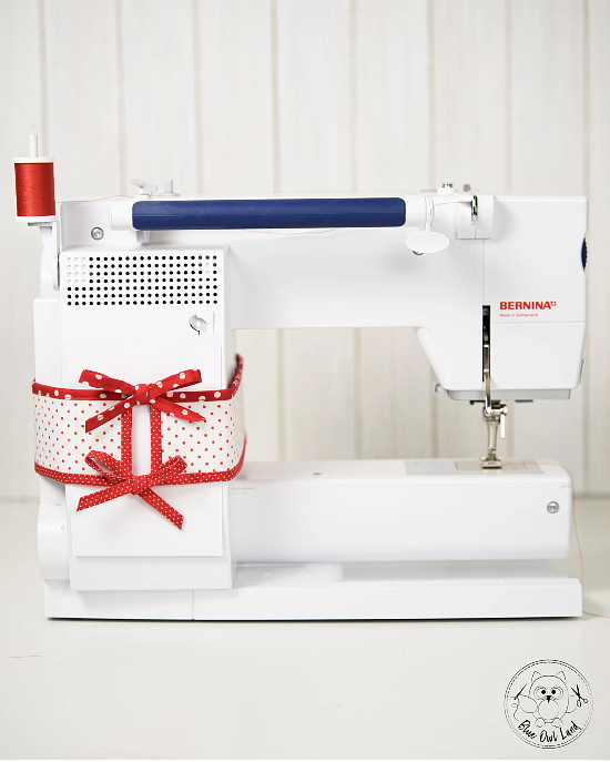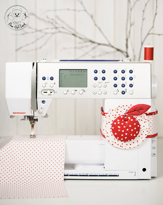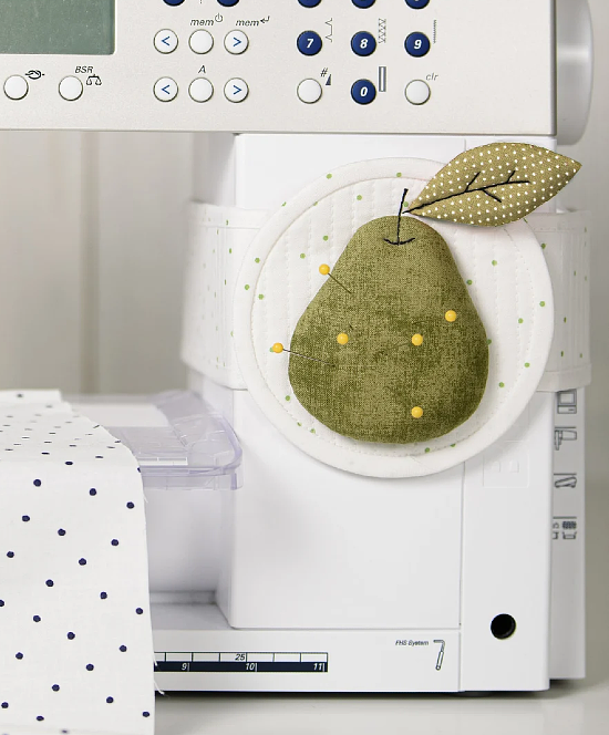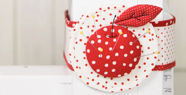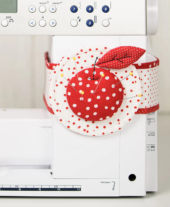 The pincushions tie around the machine with matching belts so you always have a spot handy for pins. Or, omit the belts and let them sit next to the machine.