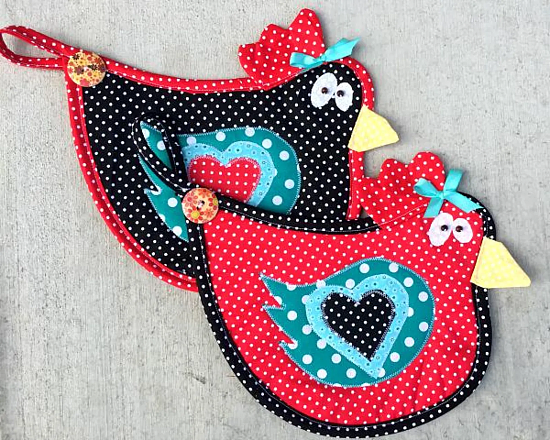 These whimsical pot holders are a wonderful gift for anyone who likes chickens. They will be charming in your kitchen, too. The chickens have a bit of a goofy look in their eyes, making them all the more appealing.