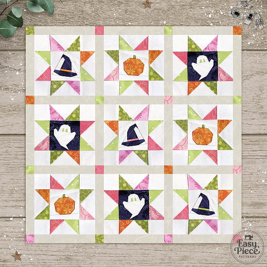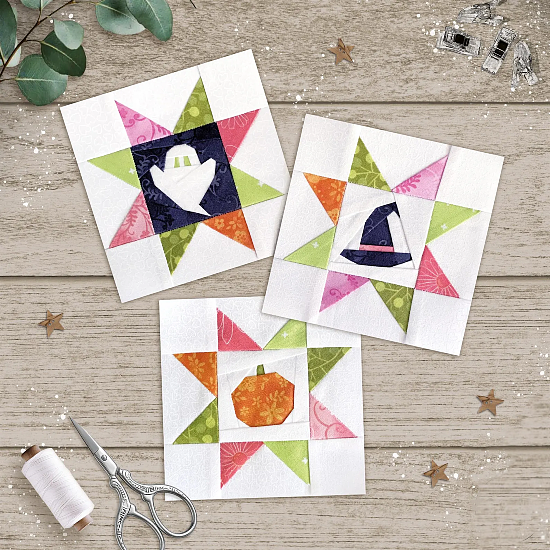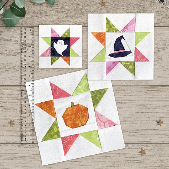 Make something fun for Halloween with these darling mini quilt blocks. Sawtooth stars are dressed up for the season with cute ghost, witch hat, and pumpkin motifs.