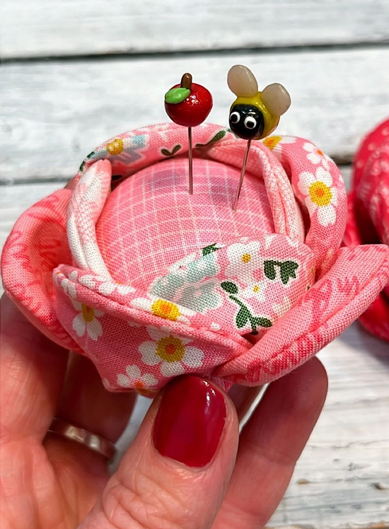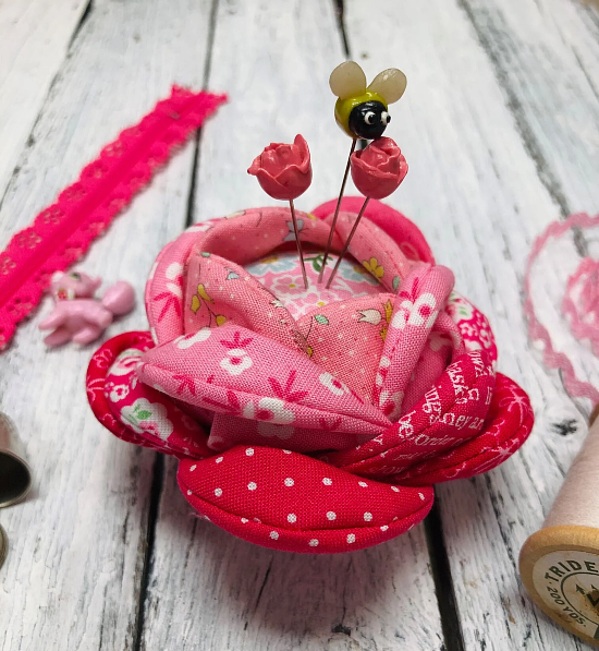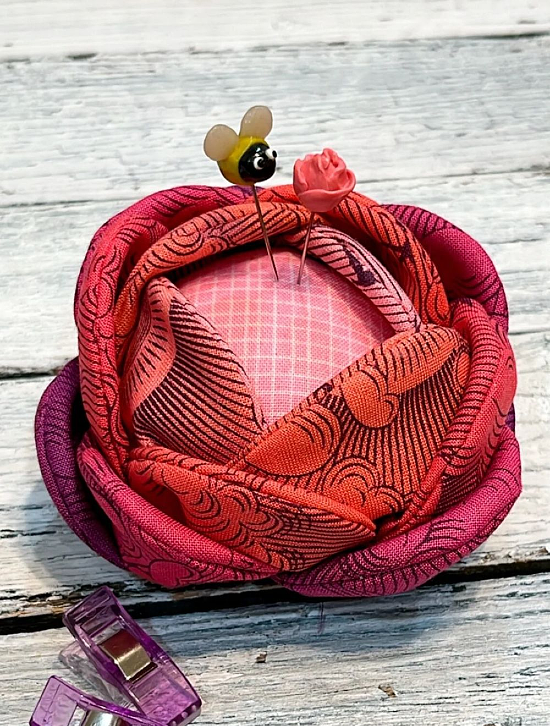 This pretty rose-shaped pincushion is both charming and helpful. The center accommodates pins, and the petals will handle clips.