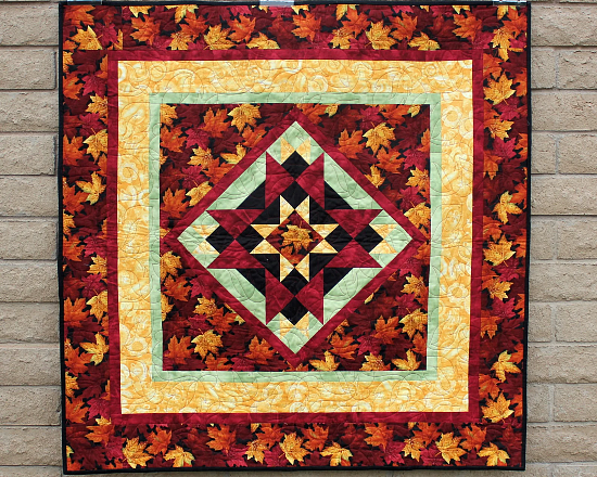 One pieced block is framed in several borders to create a beautiful table or wall quilt. This is a lovely piece that will bring warmth and color to any room.
