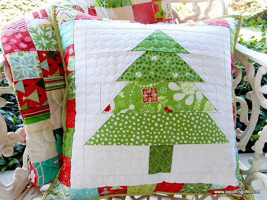 Leftover 2 1/2″ jelly roll strips can be put to good use in this pretty pillow. An easy pieced tree against a white background is framed with scrappy squares for a charming holiday accent.