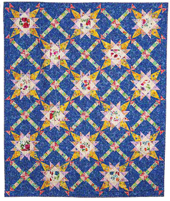 French country lanes bordered by fields of flowers inspired this beautiful quilt. Sunbathed colors set off by a lovely blue sky create a striking quilt.