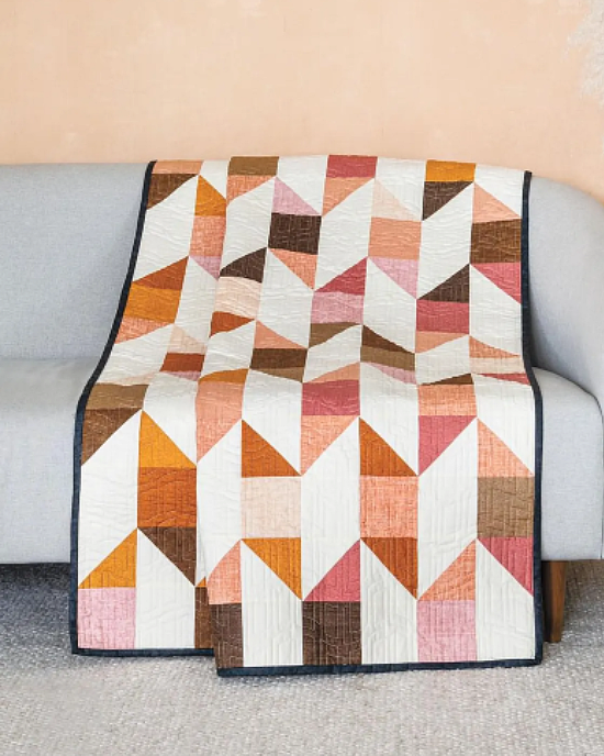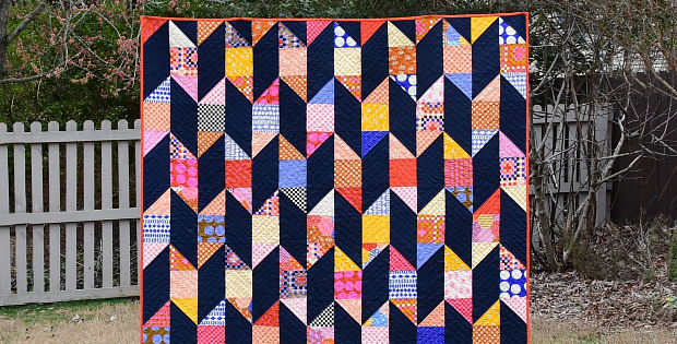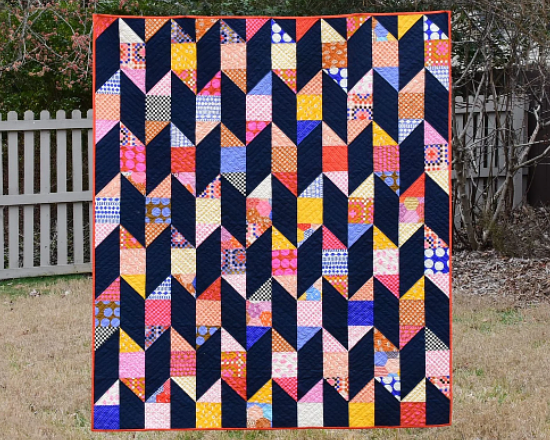A striking herringbone design makes this quilt stand out in a crowd. Vivid prints against black make it a real eye-catcher, although it’s also beautiful in softer color themes.