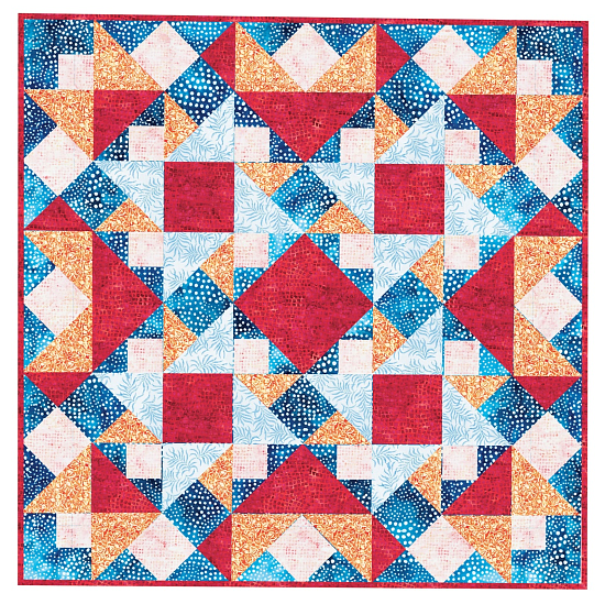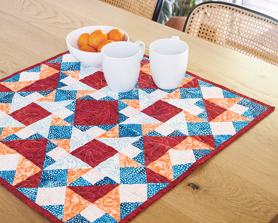 Brighten your table with this striking little quilt that’s charming in any color theme. It’s a fun design because you can easily change the look by altering the value placements.