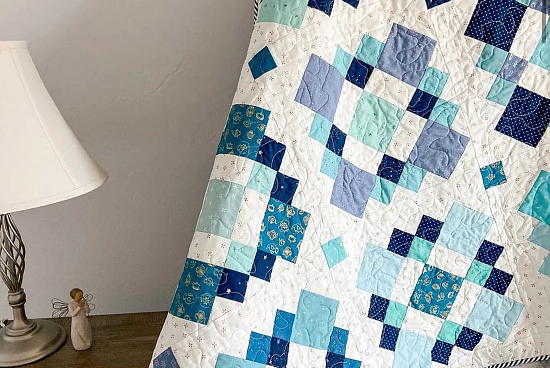 This modern take on Granny Square blocks makes a striking quilt. The low-volume print used for the background softens the look, yet the quilt is crisp and eye-catching.