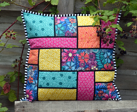 A wide variety of colorful prints outlined in black creates a beautiful throw pillow with a stained-glass effect. Not only is this a great project for featuring favorite prints, it’s also a chance to learn a new technique.