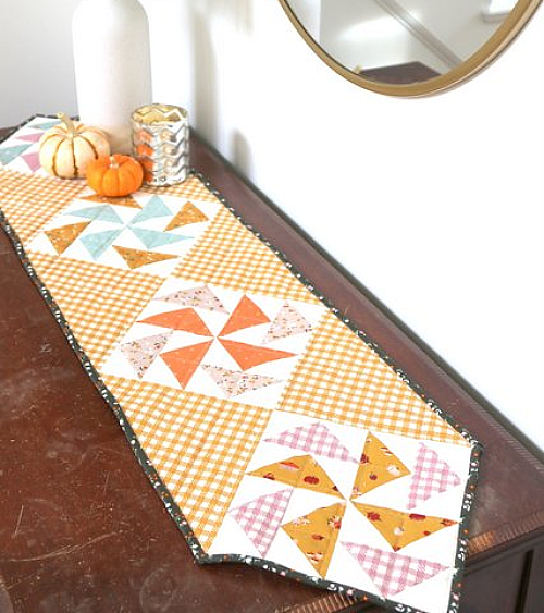Four blocks separated by triangles make a lovely runner. While this one was designed for fall, it will be beautiful in colors and fabrics for any season.