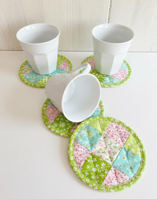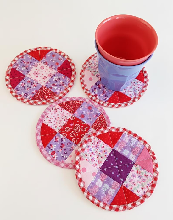 Turn scraps into cute coasters to use around your home. They also make nice gifts for many occasions and will be delightful in any color palette.