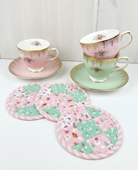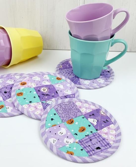 Use a pencil compass, bowl, or other round item to mark and cut out 5″ circles and apply bias bindings. That’s it! You can have several of these made in a couple of hours (the designer says they take 15 minutes each!).