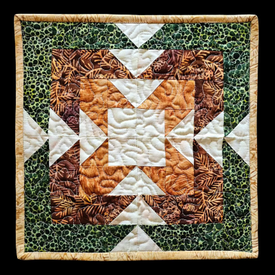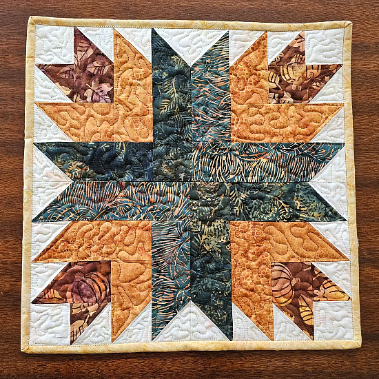 Turn four simple blocks into a charming little quilt to enjoy any time of the year. Autumn-themed batiks add texture to the quilt, but it will be just as charming in any color theme and most fabric styles.