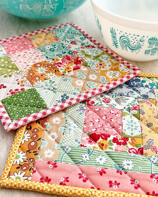 Start with scraps, orphan 8″ blocks, pretty prints, or fussy cut motifs. There are many ways you can design your own version of these potholders, and they can be made to suit any occasion.